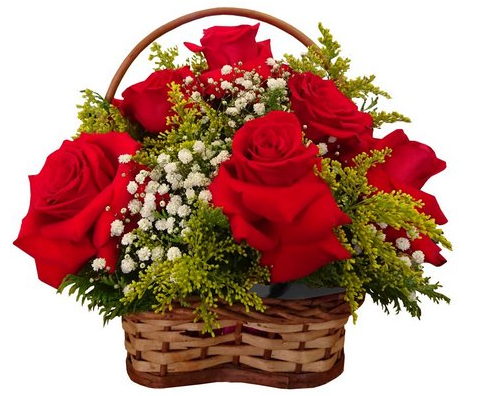 Cesta Pequena com 06 Rosas Colombianas Vermelhas e Folhagem Especial.